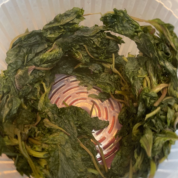 全部入ったら蓋をして20分煮出します。煮た後の葉は、赤色成分がなくなって緑色に変わっています。