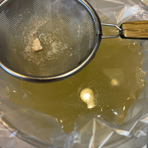 ポリ袋の下の端を切り、茶こしなどで濾します。