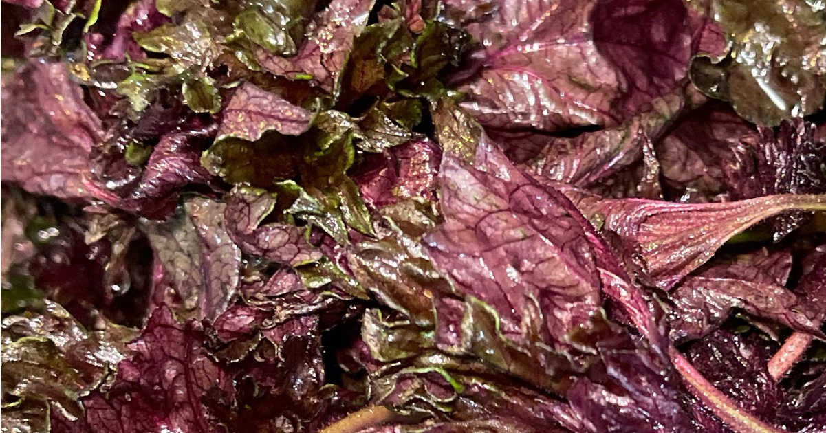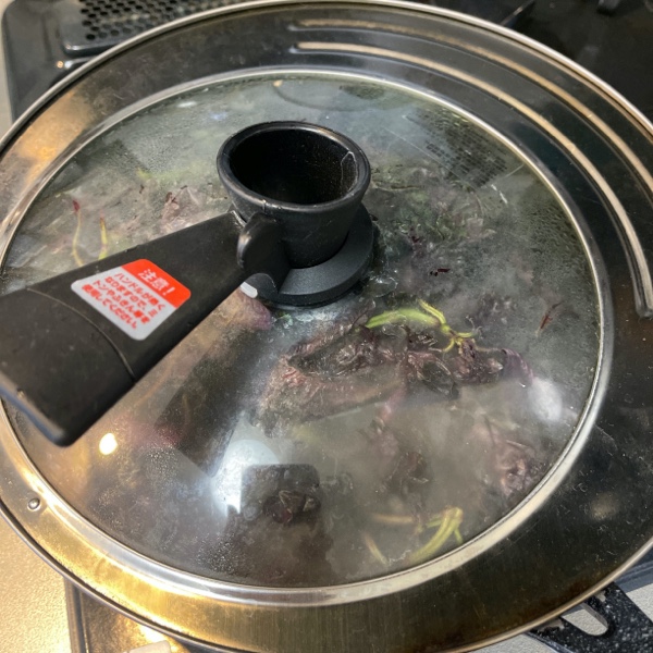全部入ったら蓋をして20分煮出します。煮た後の葉は、赤色成分がなくなって緑色に変わっています。