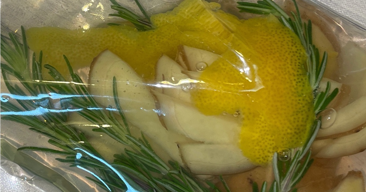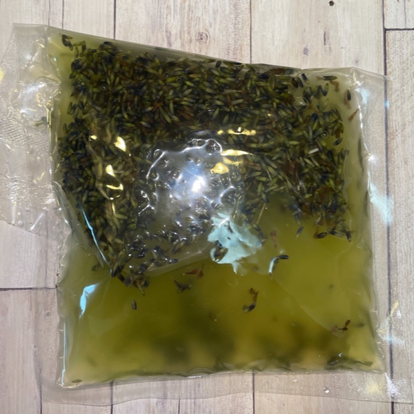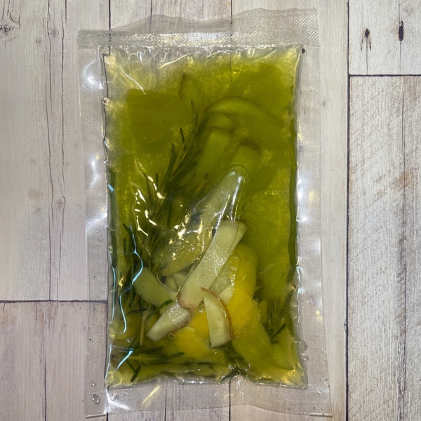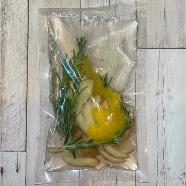 78°のアルコール50ml(+減るからちょっと多めの分量)と合わせて低温調理機にかけ、60℃で1時間抽出。ハーブ類の分量は適当です。